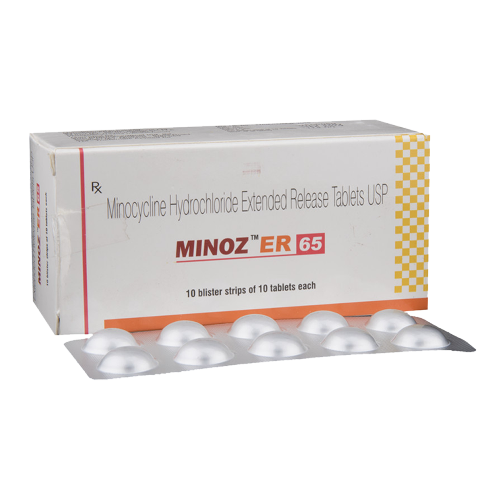 Minoz ER 65 Tablet is an antibiotic medication used to combat bacterial infections throughout the body. It is particularly effective in treating infections of the lungs, urinary tract, eyes, and other areas. By eliminating bacteria, this medication alleviates symptoms and facilitates the recovery process. Additionally, it can be utilized to manage severe acne.